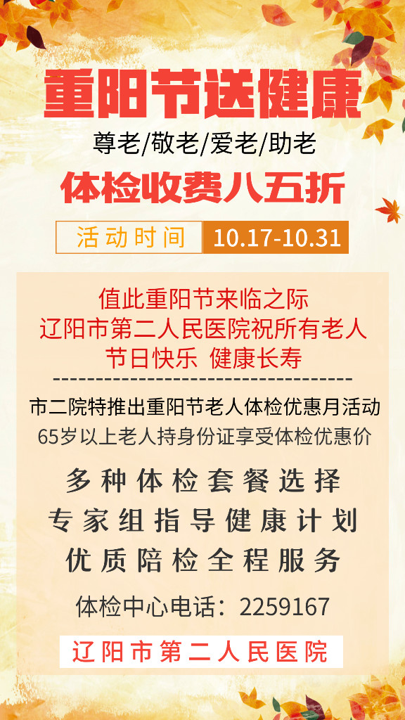 遼陽二院祝老年朋友們重陽節(jié)快樂!特推65歲以上老人體檢優(yōu)惠月活動。