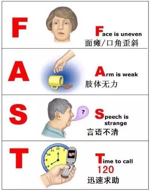 日常生活中,尤其是中老年朋友,一旦在家中出現(xiàn)肢體麻木無(wú)力、頭痛或頭昏、口眼歪斜、言語(yǔ)不清等癥狀時(shí),希望患者和家屬都能想起快速識(shí)別腦卒中的FAST原則。