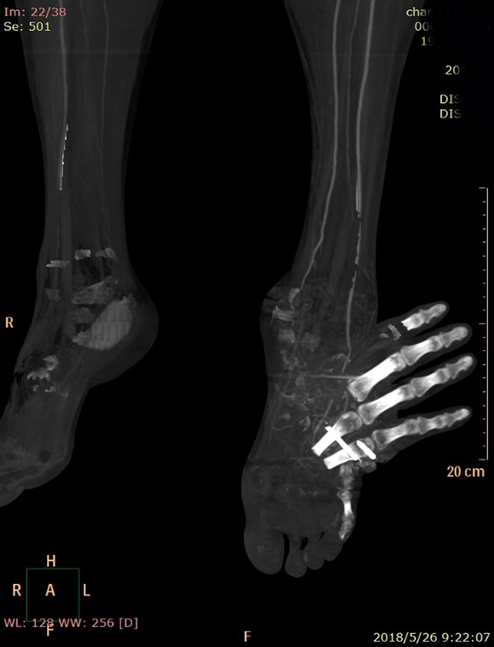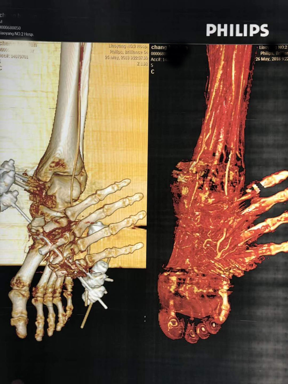 5月26日,一個(gè)普通但卻不平凡的周末,CT室杜云鵬主任接診了一位特殊的患者(異位寄養(yǎng)),該患者左手大部分寄養(yǎng)于左足,在我科進(jìn)行了下肢動(dòng)脈CTA檢查,杜主任運(yùn)用各種圖像后處理技術(shù),用立體直觀完美的圖像顯示出寄養(yǎng)于左足的左手血運(yùn)良好,血管顯示清晰,充分說(shuō)明寄養(yǎng)成功、證明了CTA后重建技術(shù)的強(qiáng)大。