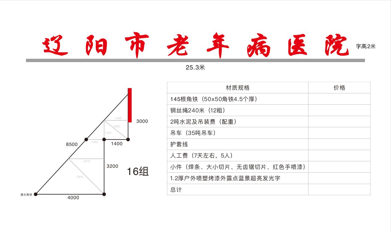 2、項目內(nèi)容:在遼陽市二院門診樓頂部安裝“遼陽市老年病醫(yī)院”八個LED發(fā)光大字,具體詳情如下: