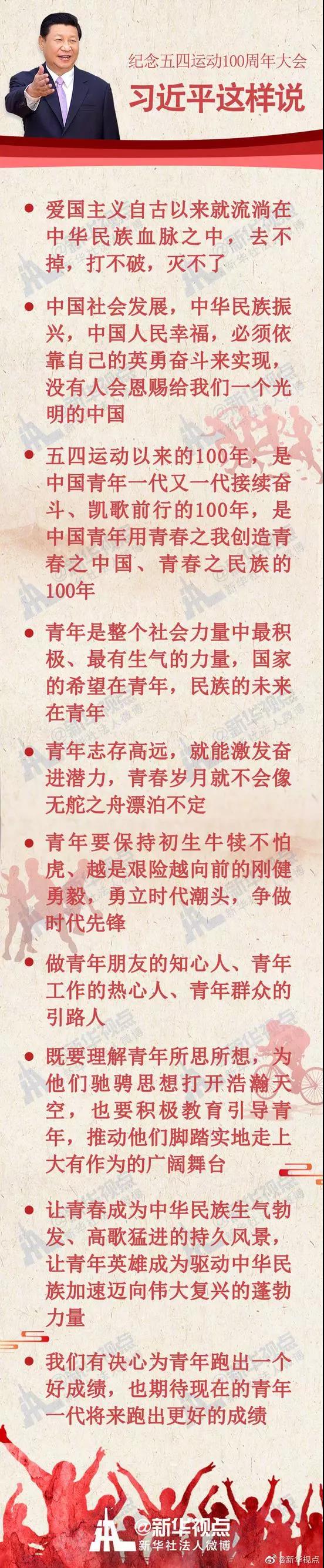 紀(jì)念五四運(yùn)動(dòng)100周年大會(huì)于4月30上午10:30在北京人民大會(huì)堂隆重舉行,中共中央總書記、國家主席、中央軍委主席習(xí)近平出席大會(huì)并發(fā)表重要講話。