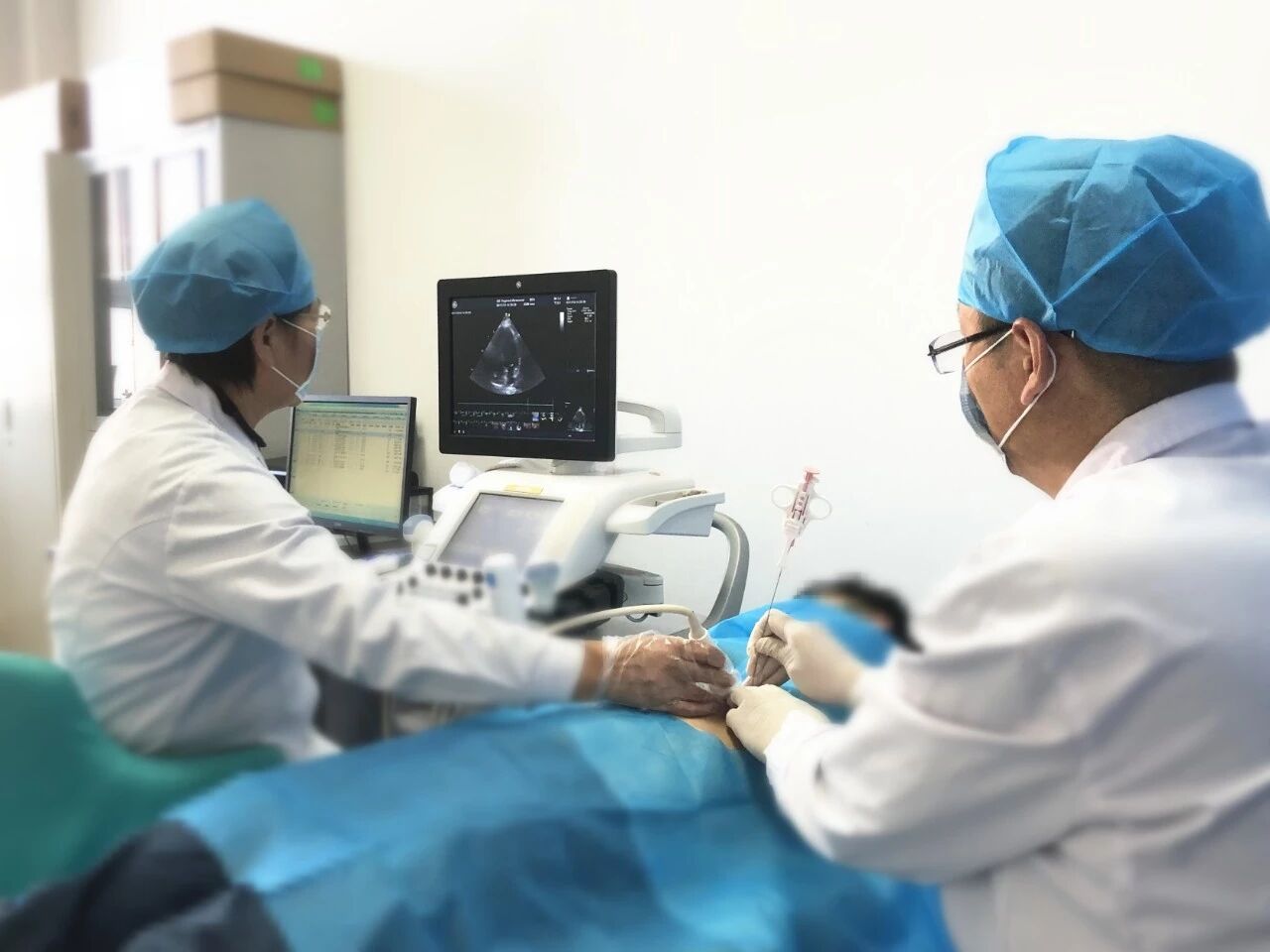 科主任張俊波當機立斷,決定為其實施彩超下心包腔置管引流術(shù)。患者護送到彩超室后,超聲科王麗主任為患者進行超聲定位,張俊波主任為患者穿刺,兩位主任默契配合,在僅僅不到10分鐘的時間內(nèi),就順利完成心包腔置管引流術(shù),患者呼吸困難癥狀迅速得到緩解。
