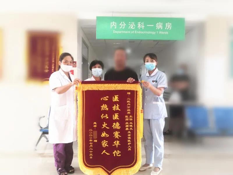 “內(nèi)分泌一科醫(yī)生和護(hù)士們的工作認(rèn)真負(fù)責(zé),醫(yī)術(shù)精湛,對(duì)病人服務(wù)態(tài)度好,像對(duì)待家人一樣”。7月24日上午,我院內(nèi)分泌一科出院患者徐大爺?shù)募覍侔褜懼?ldquo;心熱似火如家人,醫(yī)技醫(yī)德賽華佗”的錦旗送到主任王姝文手中,并衷心的感謝住院期間醫(yī)護(hù)人員給予的精心治療和照顧。