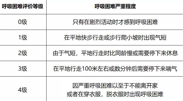 氣短或呼吸困難是慢性阻性肺疾病的主要癥狀,早期在勞動時(shí)出現(xiàn),后逐漸加重,以致在日常生活甚至休息時(shí)也感到氣短(下滑參考呼吸困難等級表)。
