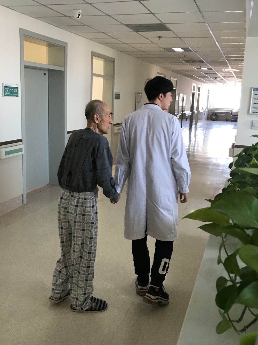我科有一位特別的患者,一位總和醫(yī)護(hù)人員牽手的患者。老人81歲了有些糊涂經(jīng)常打兒子罵陪護(hù),總是到辦公室來找大夫,每天當(dāng)班的醫(yī)生不同卻從沒有人拒絕過老人。抓拍到的分別是我科肖東,夏文兩名醫(yī)生,正在送老人回病房。老人緊緊的攥著醫(yī)生的手,他分不清誰是誰,只是他認(rèn)這身白大衣,相信這穿白大衣的人。