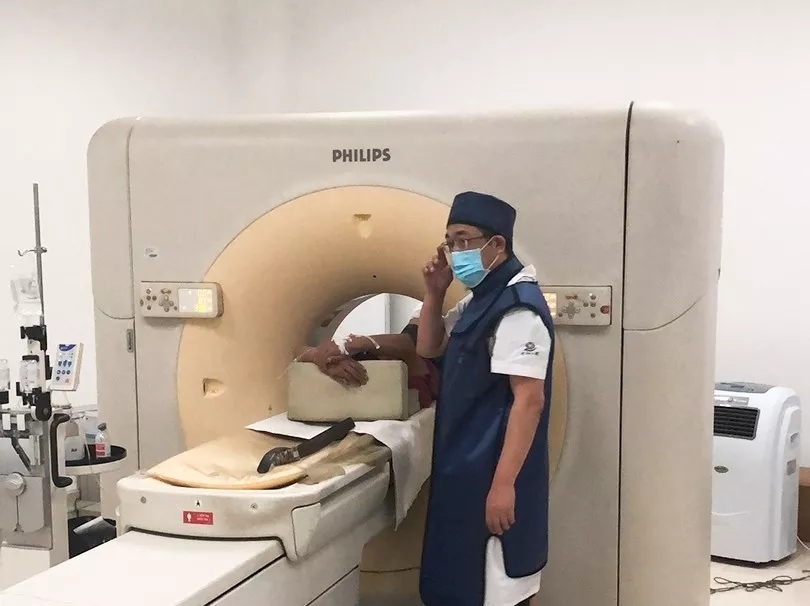 8月14日,骨科的一名患者在醫(yī)生崔永強(qiáng)的陪同下,到我們CT室做相關(guān)檢查,此項(xiàng)特殊檢查必須要有家屬陪同,而且陪同時(shí)間較長(zhǎng),患者家屬未成年,根據(jù)放射衛(wèi)生防護(hù)法不能進(jìn)行陪護(hù)檢查。正在患者和家屬為難之際,崔大夫二話沒(méi)說(shuō),套上防護(hù)服就跟著進(jìn)了檢查室,輕輕的一句“我來(lái)替你的家屬”溫暖了患者和家屬的心,也感染了操作臺(tái)前的我,隨手拍下了這張照片。